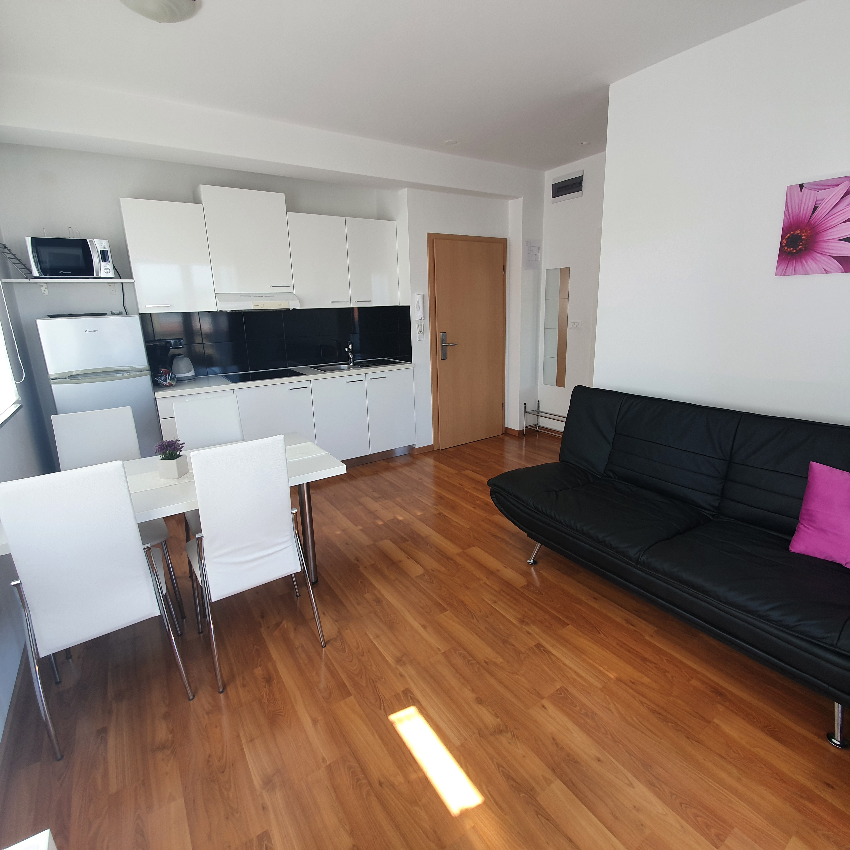 • opremljena kuhinja – hladnjak sa zamrzivačem, ploča za kuhanje, kuhalo za vodu, posuđe, perilica posuđa, mikrovalna pećnica, aparat za kavu, toster
