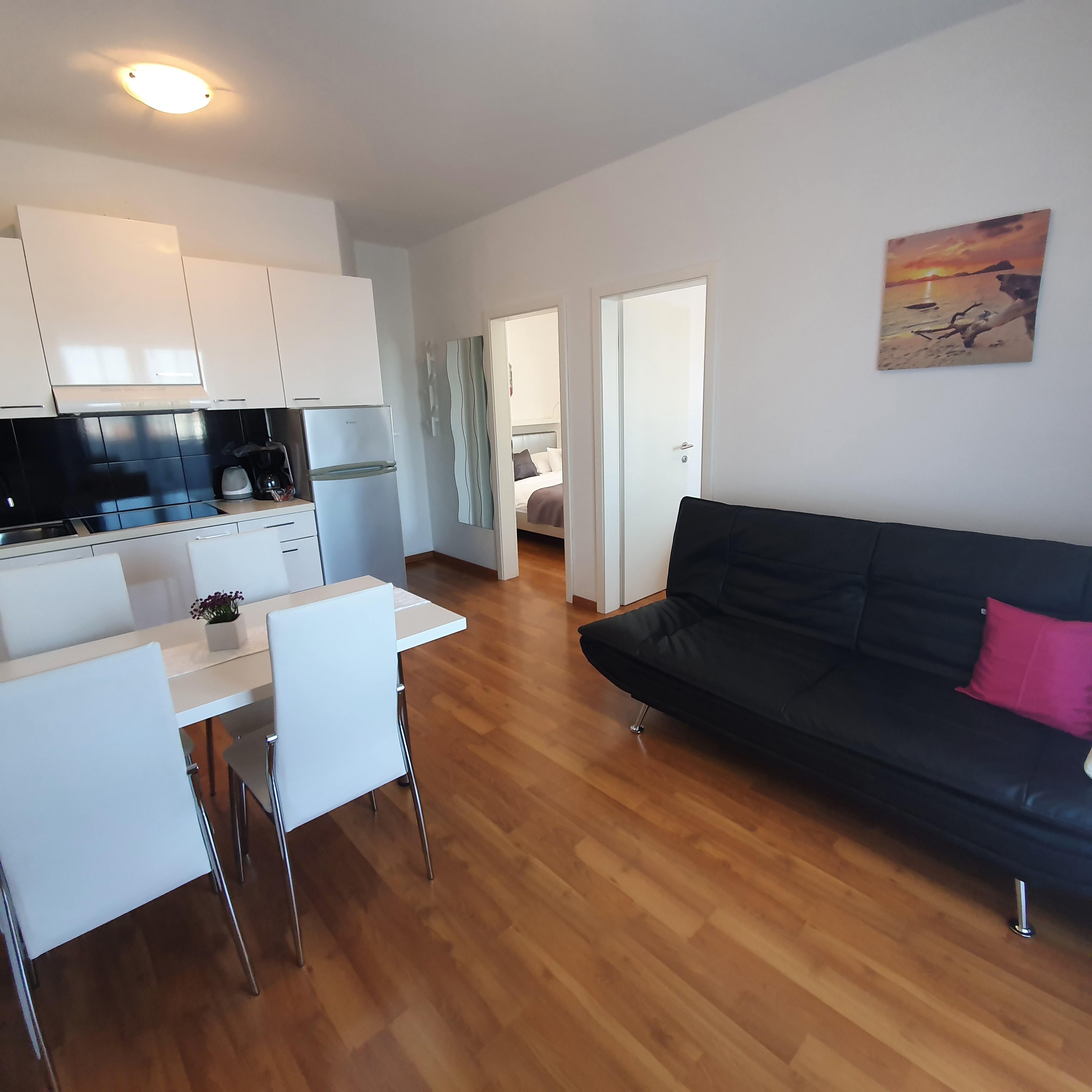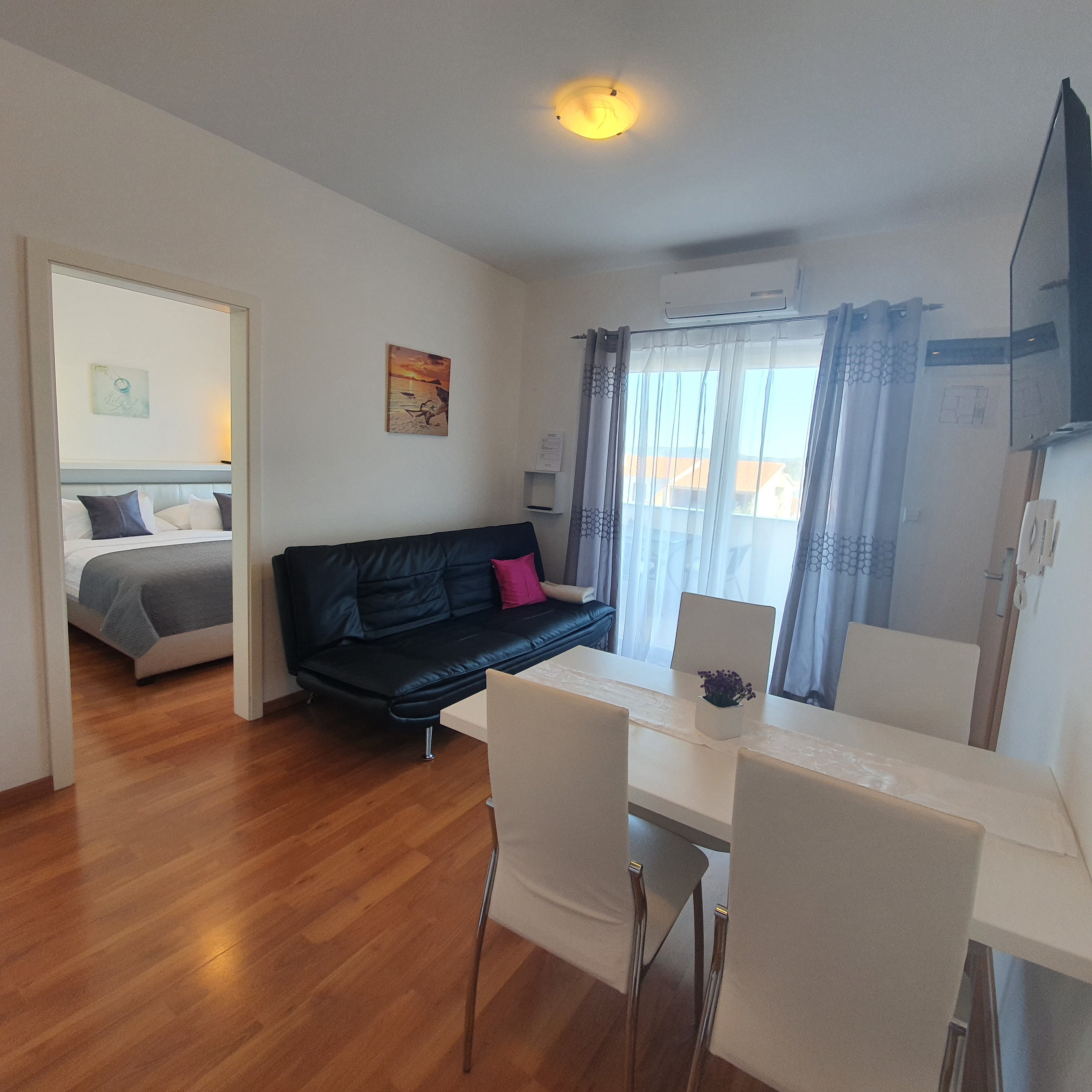 Two-bedroom apartment with a terrace is located on the first floor. Each bedroom has a double bed. Kitchen, living room and dining room are in one room. Terrace can be reached from one bedroom and a living room.